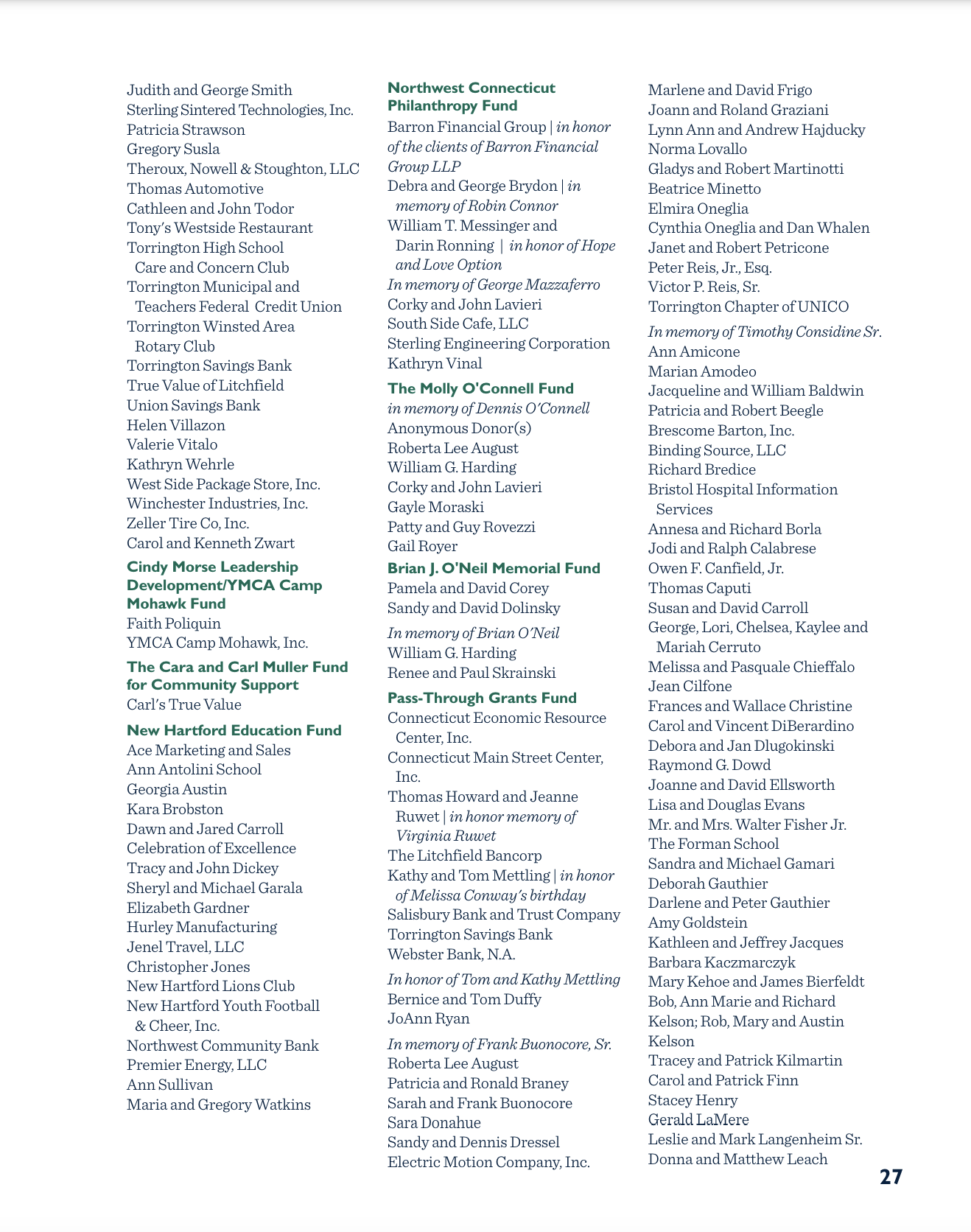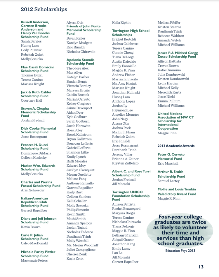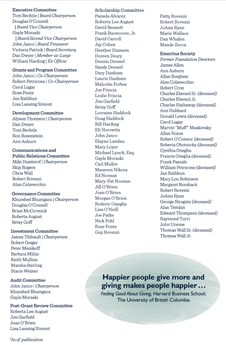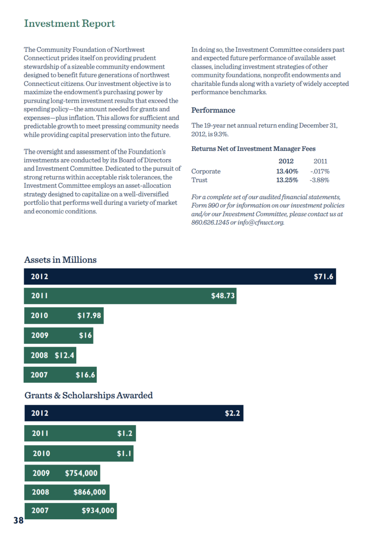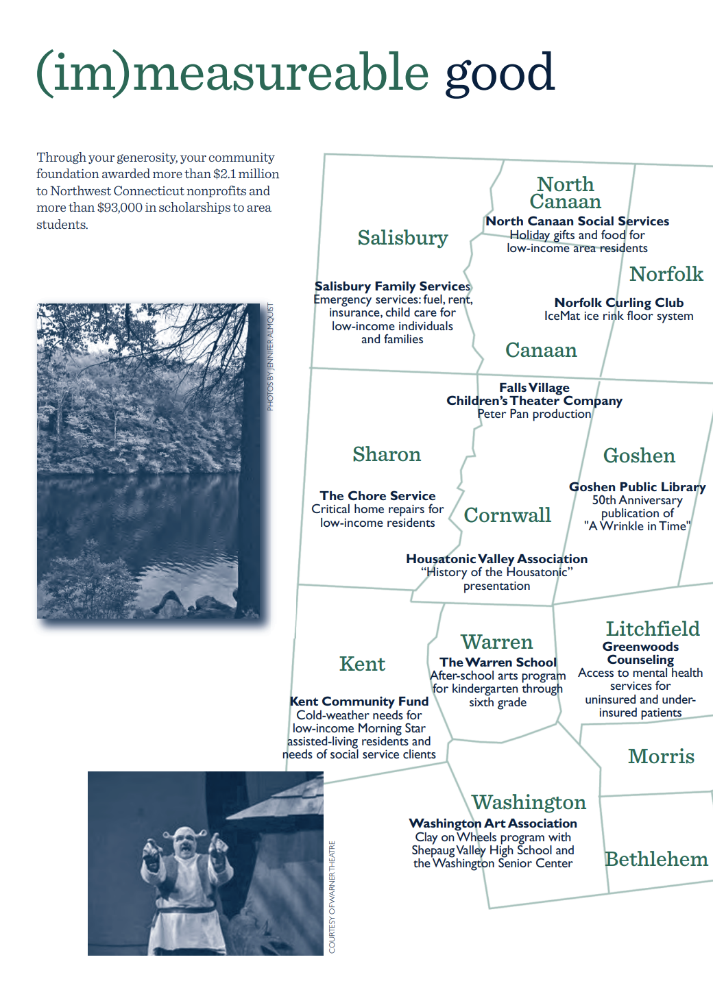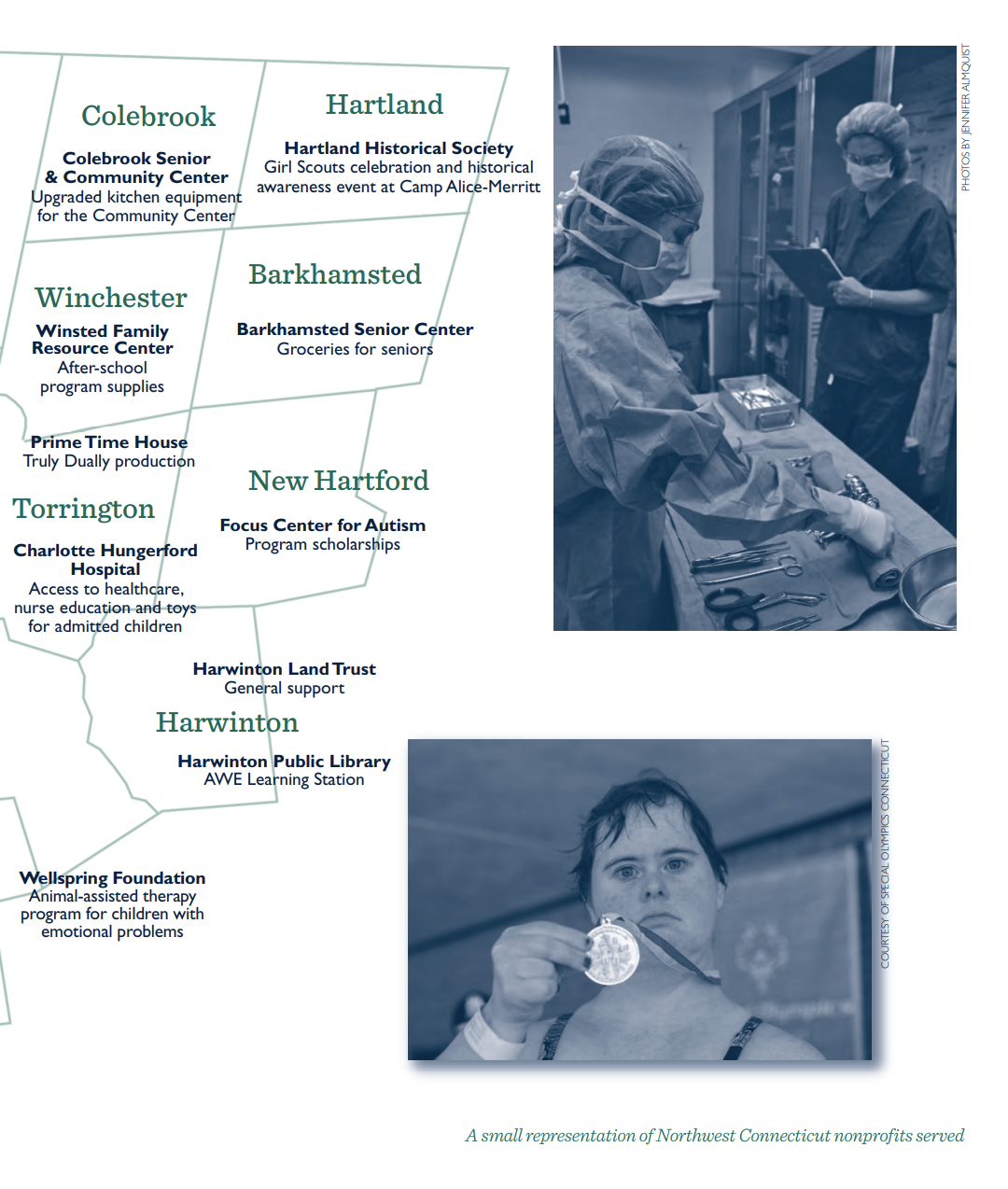 Grants and scholarships from these funds have allowed us to double our philanthropic distributions to $2,215,090 in just two years. This report provides us with an opportunity to recognize all that has been made possible through these grants and scholarships. Even more important, perhaps, is that it offers a glimpse into the hearts of our donors and the passion they share for our beloved Northwest Connecticut.