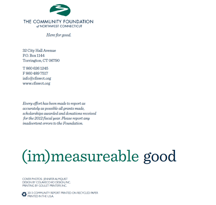 At the Community Foundation of Northwest Connecticut, we are trying to make good decisions—ones that are equitable for our communities and mindful of our promise to honor the wishes of those who have given us the ability to assist others. The trustees and staff of the Foundation are grateful for this opportunity, and we work to provide the type of stewardship and services that you and our communities can be proud of.