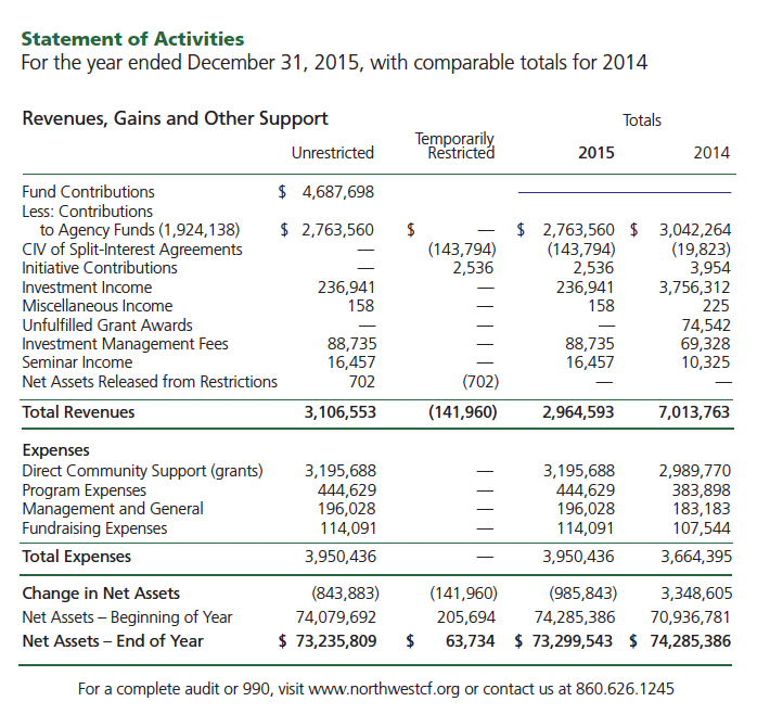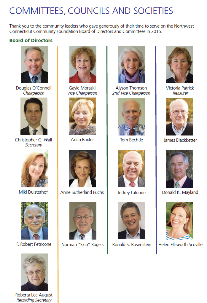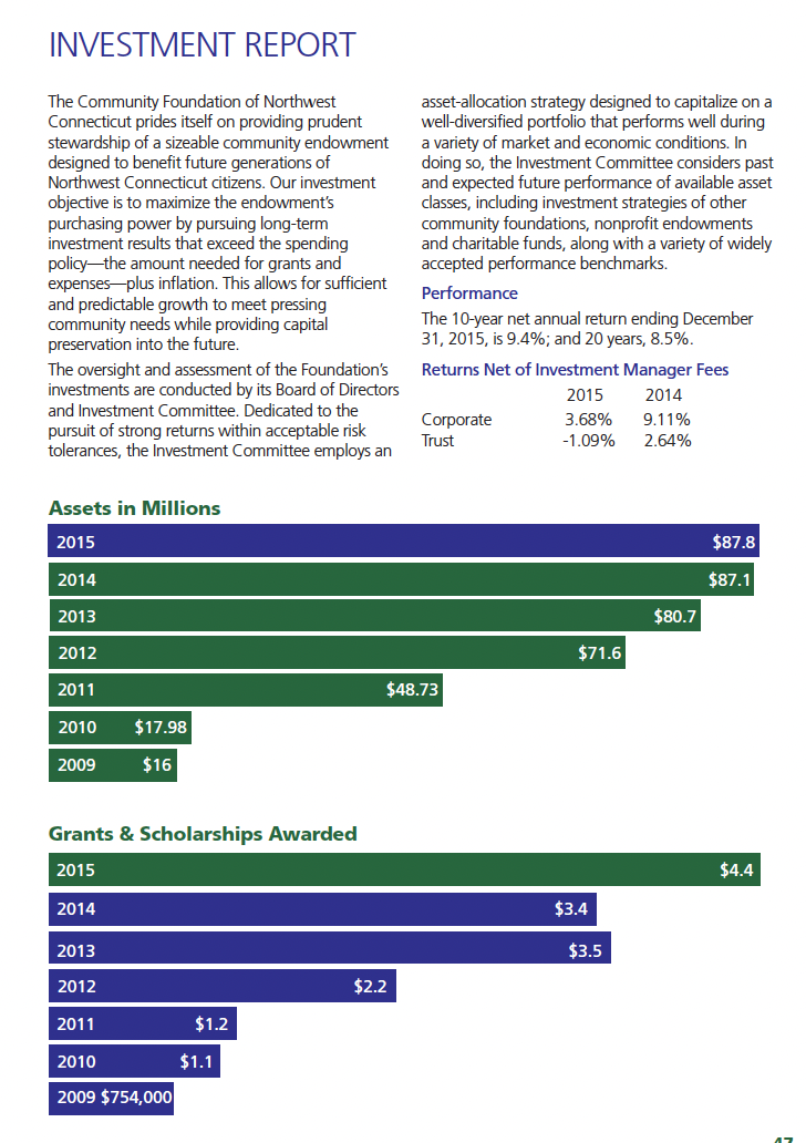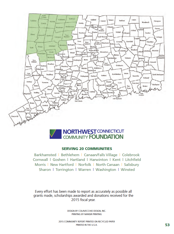 Building on a record of over $4 million in grants in 2015 and fund investment returns that led the nation when compared to our community foundation peers, we are looking forward to tomorrow’s challenges with a commitment to performance and a vision of leadership that make us Northwest Connecticut’s Community Foundation, in name, in spirit, and in practice.