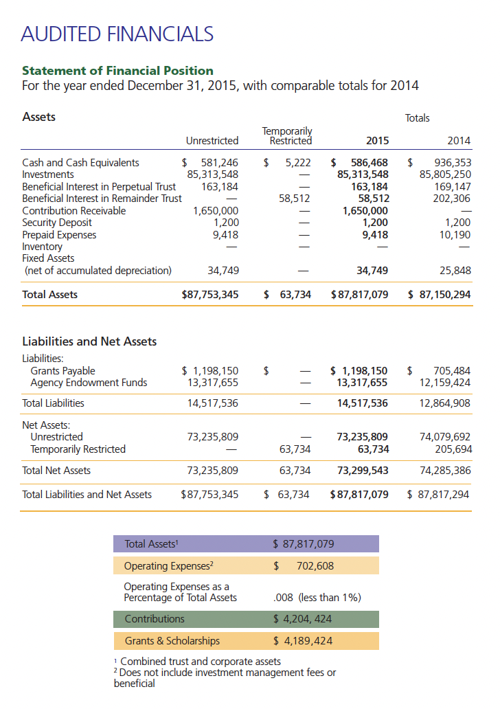 The Foundation’s record of accomplishment in 2015 – the sum total of innovations, efficiencies and modern business practices we apply to local philanthropy is a source of pride and humility.