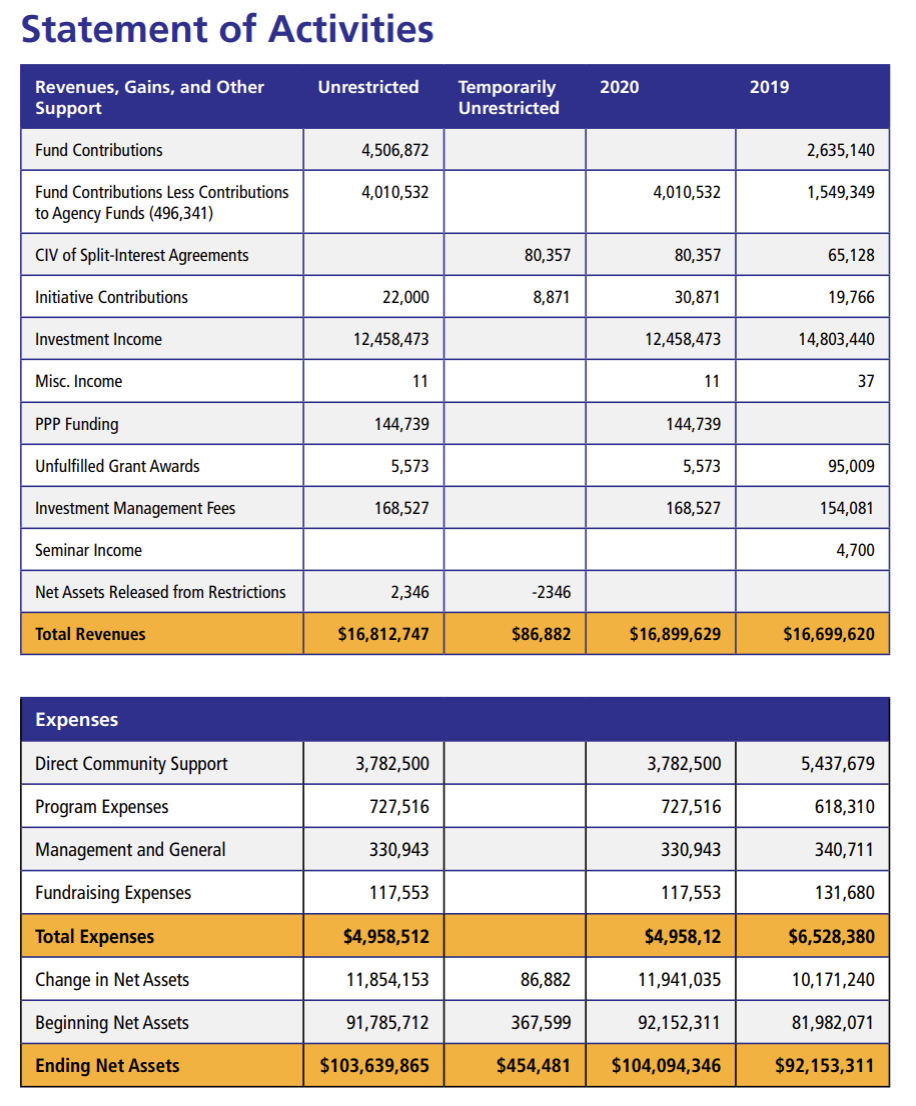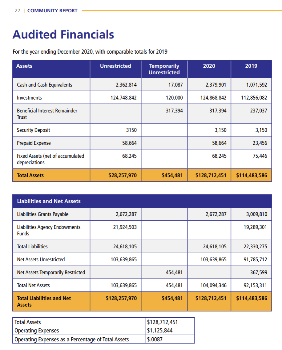 The oversight and assessment of the Foundation’s investments are conducted by its Board of Directors and Investment Committee. Dedicated to the pursuit of strong returns within acceptable risk tolerances, the Investment Committee employs an asset-allocation strategy designed to capitalize on a well-diversified portfolio that performs well during a variety of market and economic conditions. In doing so, the Investment Committee considers past and expected future performance of available asset classes, including investment strategies of other community foundations, nonprofit endowments and charitable funds, along with a variety of widely accepted performance benchmarks.