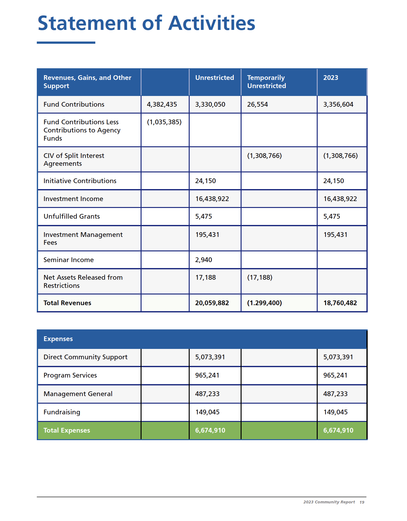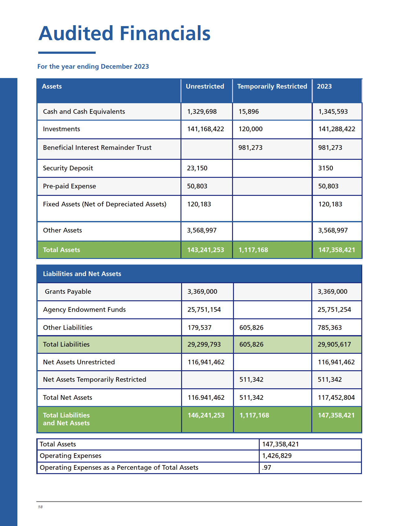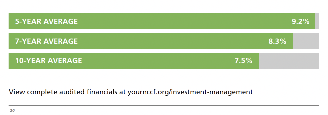 Our goal has always been to nurture and enhance the value of our philanthropic assets over the long term–as markets allow from year-to-year–by seeking the highest possible inflation-adjusted returns directed by an asset-allocation policy that is overseen by our Board of Trustees and operating at all times within a prudent level of risk as determined by the ongoing vigilance of our Investment Committee, which reports to the Board. NCCF employs a total-return approach–the industry standard–in which asset yield and appreciation are weighed equally in investment decisions. In the interest of transparency and compliance, our financial and investment reports are executed in accordance with investment concepts and best practices governed by both the Uniform Prudent Management of Institutional Funds Act, and the Uniform Prudent Investors Act. We are pleased to continue offering customized accounting, so each of our funds enjoys individualized reporting, while benefiting from the economies-of-scale garnered from our pooled investment strategy. In 2023, NCCF partnered with DHK Financial Advisors, a decades-experienced financial advisor managing more than $1 billion in assets.