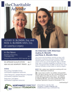 The Community Foundation recently sat down with Northwest Connecticut attorneys Audrey B. Blondin, recently named Connecticut Bar Association 2020 Citizen of the Law, and her daughter, Rose A. Blondin Shea, who is currently completing a certificate in non-profit management from UCONN, to discuss their work advising charitably inclined clients on leaving a legacy.