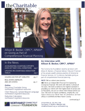The Community Foundation recently sat down with Allison B. Becker, a Financial Advisor, Fiduciam Financial of the private wealth advisory practice of Ameriprise Financial Services, LLC to discuss charitable giving as part of comprehensive financial planning.