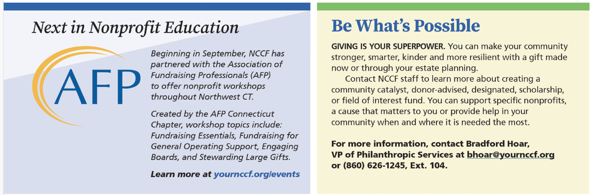 NCCF matches every donation dollar-for-dollar until each campaign reaches its goal. Matches are made possible by the Northwest CT Community Foundation: Draper Foundation Fund, Douglas and Janet Roberts Fund, Marion Wm. & Alice Edwards Fund, Carlton D. Fyler and Jenny R. Fyler Fund, Khurshed Bhumgara Fund, Eva M. Coty Fund, 1421 Opportunity Fund, Karen M. O'Connor Fund, Northwest CT Philanthropy Fund, Edwin M. Stone and Edith H. Stone Fund, and an anonymous donor family.